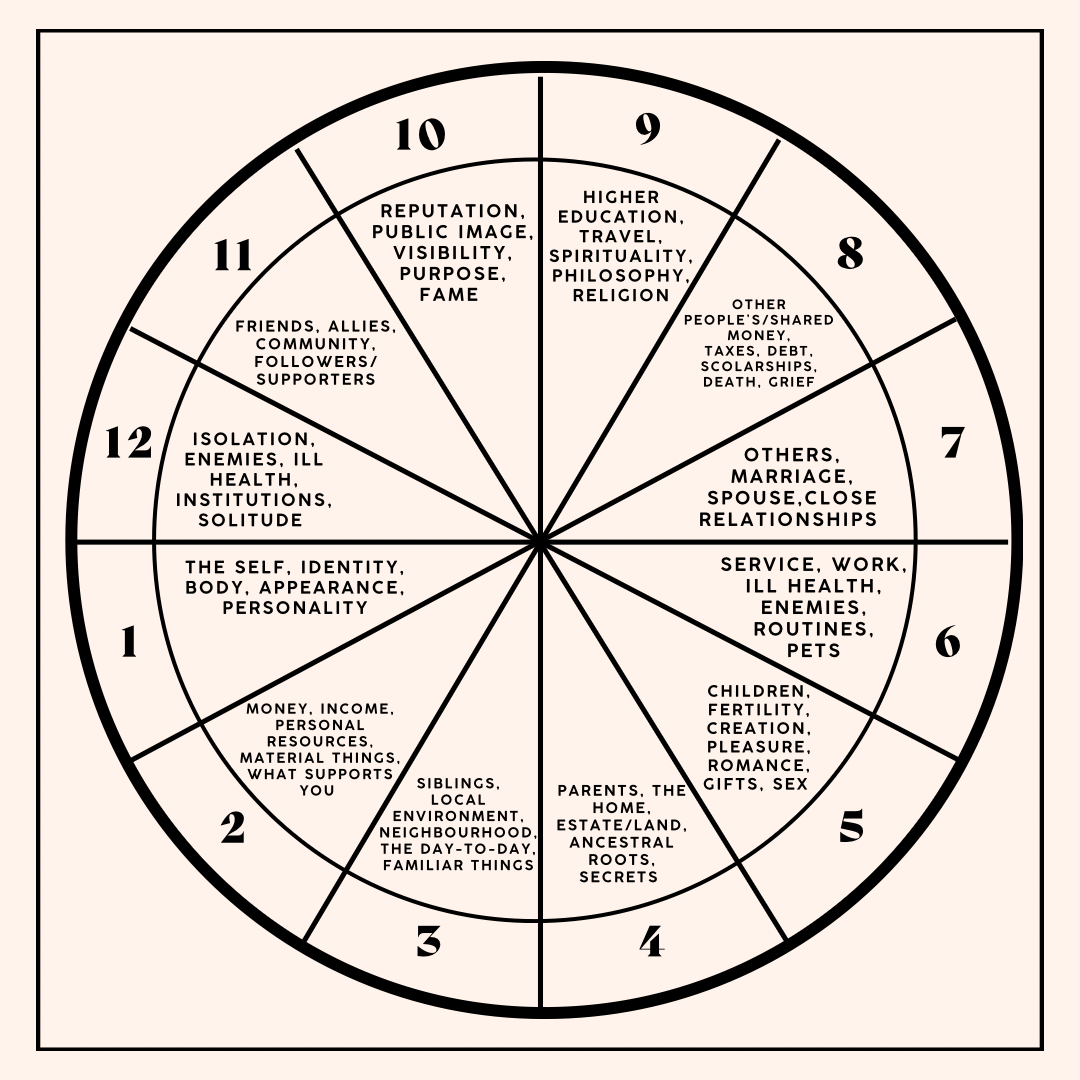 A wheel of the signification of each house in a birth chart.