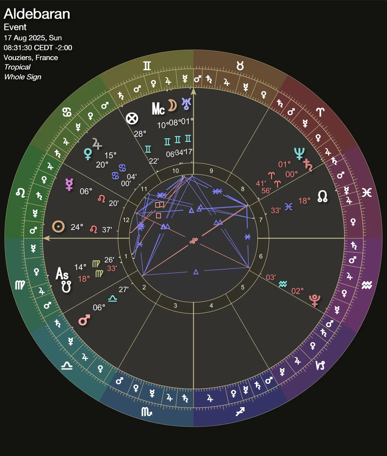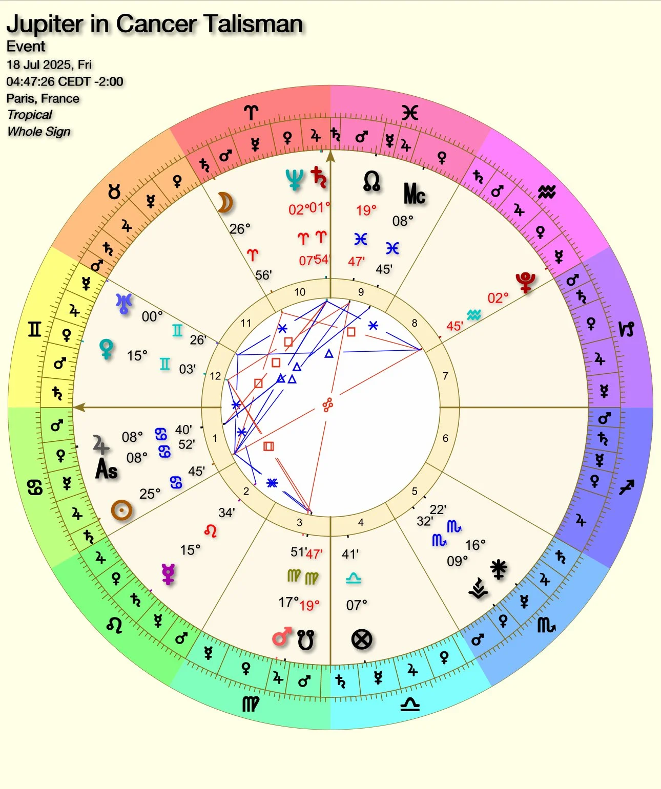 The talismans offered will be engraved with the symbol of Mars and ensouled under this very special alignment on Mars hour, as Mars and Venus rise above the horizon. To ground and pacify this special election and ensure that only the most constructive and purified Martial energy infuses these precious amulets, the Moon in Pisces will be enclosed by the benefics (separating from a sextile to Jupiter, applying to a sextile to Venus). This highly auspicious configuration has Mars in a night chart, in the sign of his exaltation and in his own term for a total dignity score of +6 — a powerfully placed Mars!
