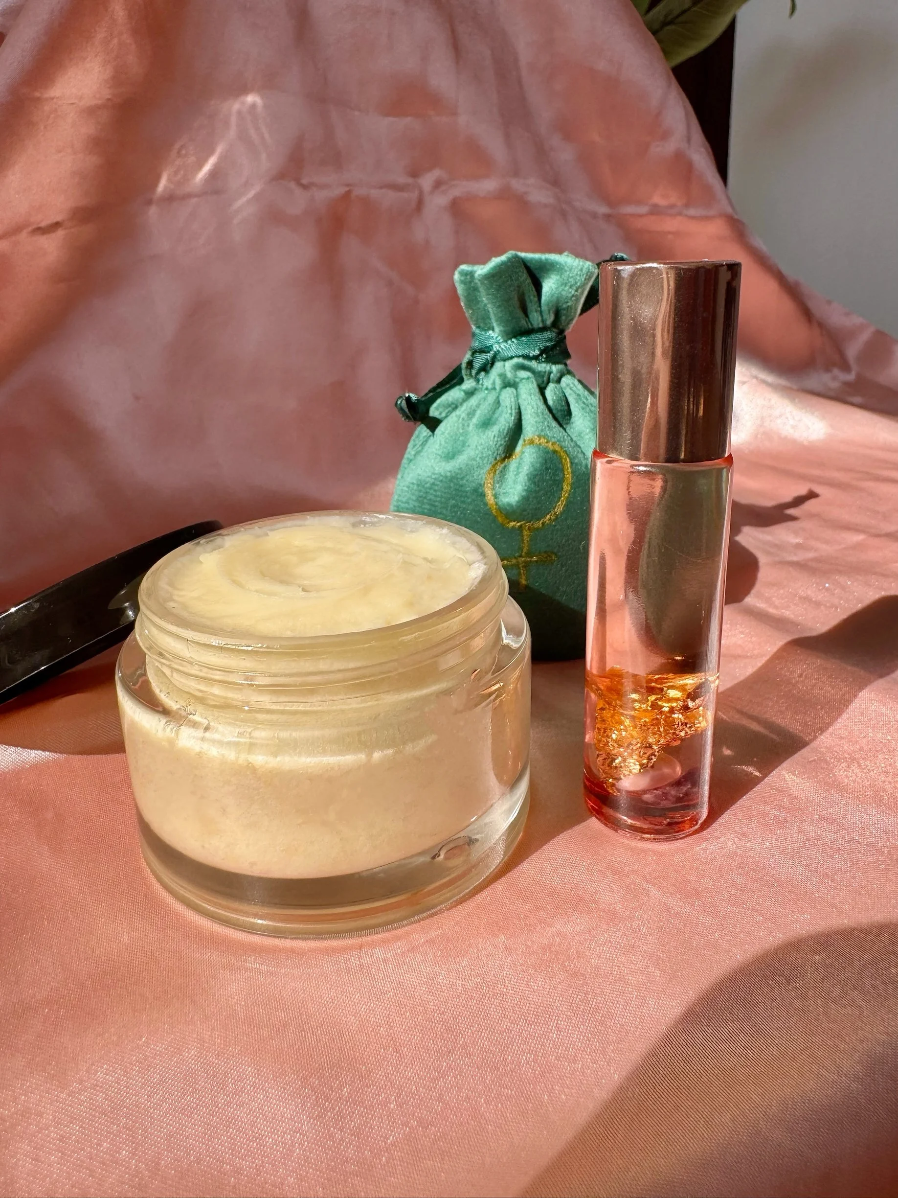 The Venus in Pisces Collection Package contains all items from the collection, either in mini format (5ml oil + 30g cream+ Venus herbal amulet) or full-sized (10ml oil + 50g cream + Venus herbal amulet). You also have the option to include a Venus in Taurus talisman in the package (subject to availability) 🌷